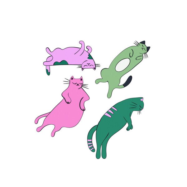 Dreamy Cat Quartet is a charming digital print that captures the serene and endearing sight of four cats sleeping in different positions. Each cat is uniquely colored in soft, pastel shades of purple, green, pink, and yellow, adding a playful yet soothing palette to the artwork.