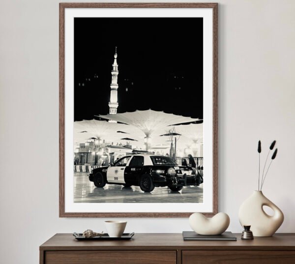 Guardians of Devotion is a black and white photograph frame capturing a poignant moment outside the Madina mosque. In the foreground, a police car stands watch, symbolising protection and security. Behind it, the iconic umbrellas of Madina are open, casting shadows against the backdrop of the mosque’s majestic minaret. This image juxtaposes modern security with timeless devotion, highlighting the coexistence of tradition and progress in sacred spaces.