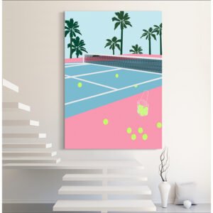 Vibrant Volley is a digital painting of a striking tennis court with a playful color scheme. The pink ground contrasts vividly with the blue court, while neon green tennis balls are depicted bouncing and scattered on the ground. A basket of tennis balls sits nearby, ready for play. In the distance, palm trees sway gently, adding a tropical touch to the energetic scene. This artwork captures the lively and fun spirit of a sunny day on the tennis court, blending sports with a whimsical, colorful aesthetic.